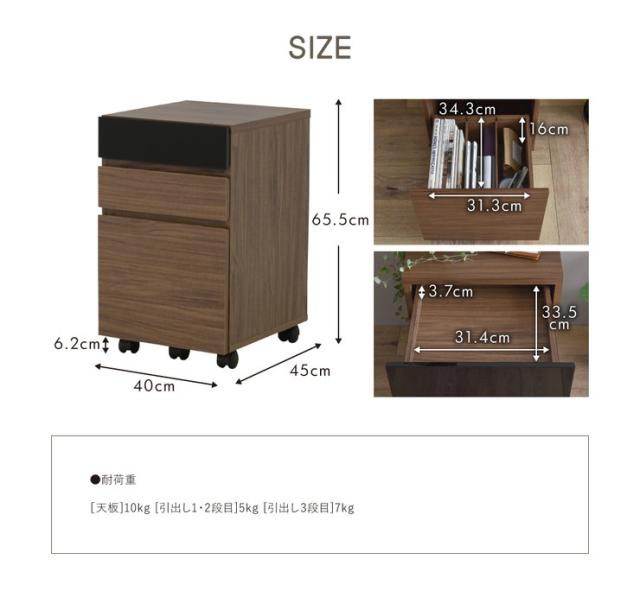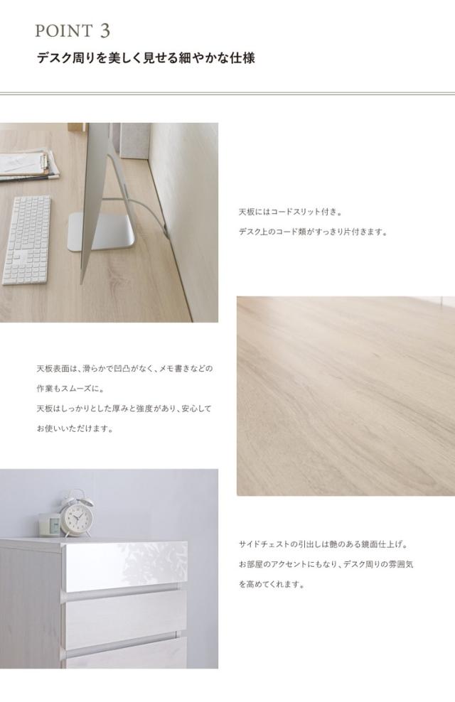 | 耐荷重 | デスク:〈天板〉約60kg, サイドチェスト:〈天板〉約10kg, 〈引出し1・2段目〉5kg, 〈引出し3段目〉約7kg |