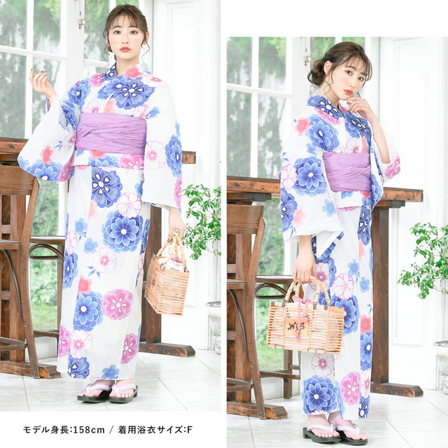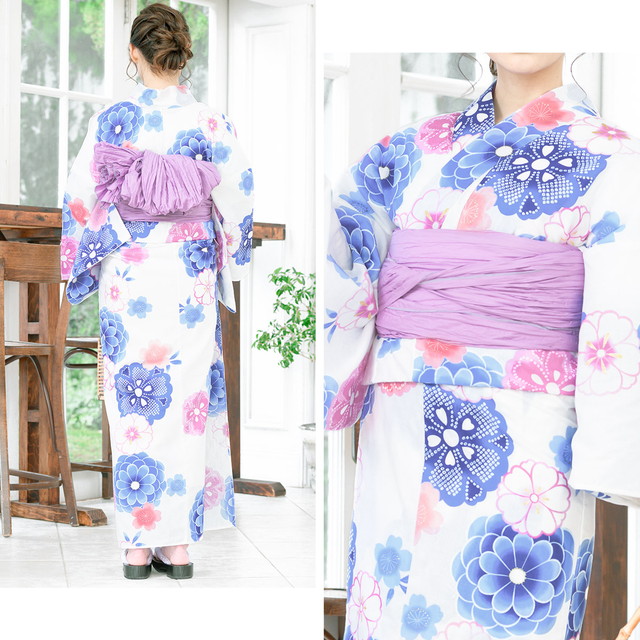 浴衣セット レディース 浴衣セット 兵児帯 大人 2点セット(浴衣/帯) 白 ホワイト 藍色 ネイビー 薄紫 菊 桜 綿 ラメ ボヌールセゾン 夏 女性用 S・フリー