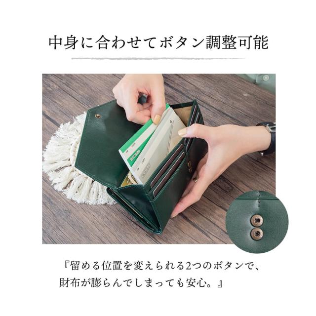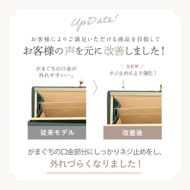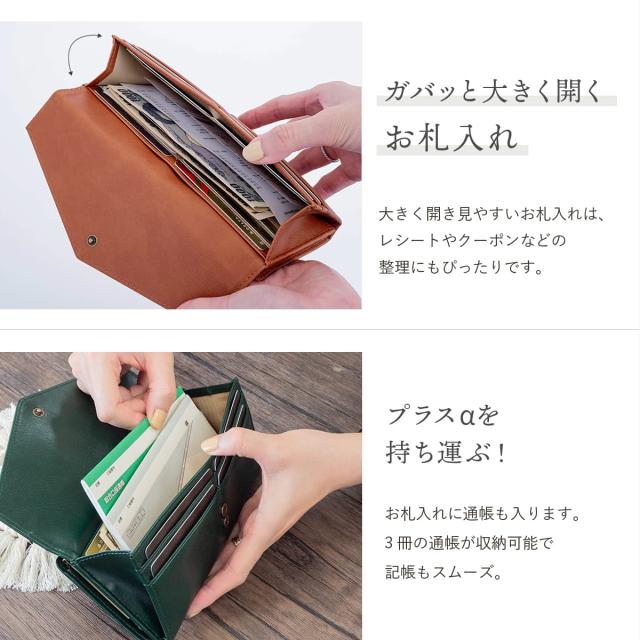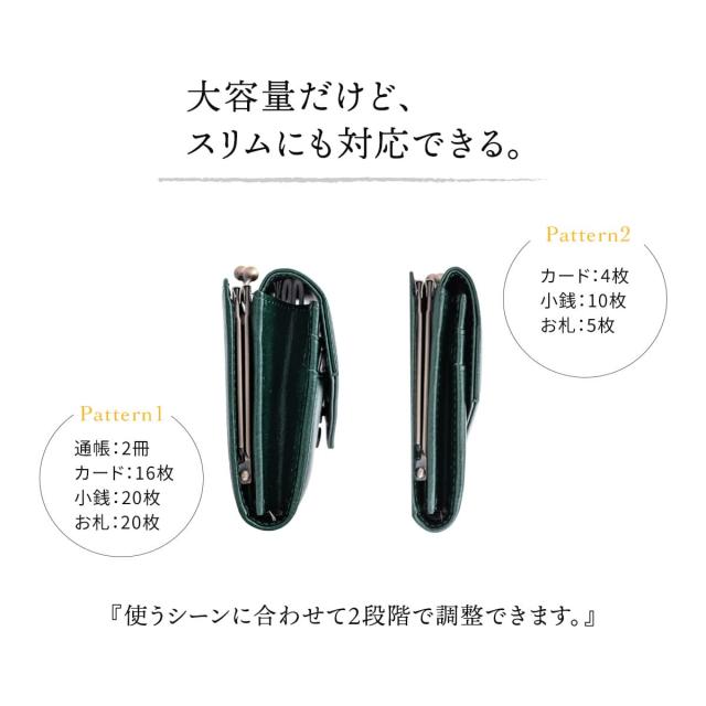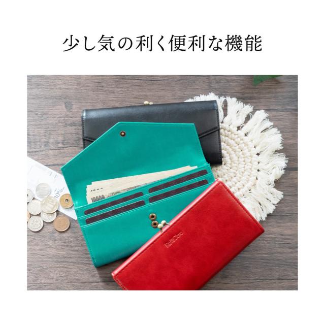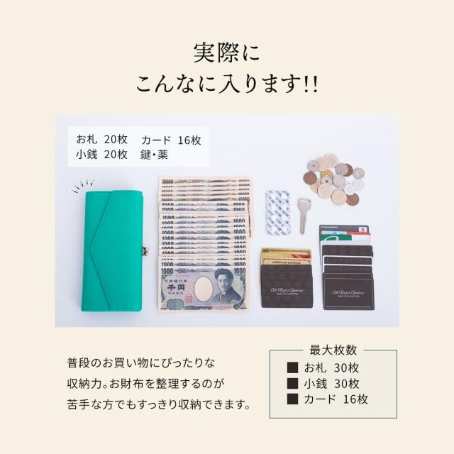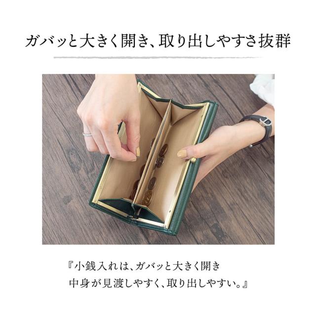 - 母へのプレゼントでグリーンを購入。ラウンド長財布を使っていてファスナーの開閉が苦手という事でがま口が良いのではないかと思い購入。がま口が使いやすく、かぶせの収納部も通帳が入ったりするので便利と喜んでい...