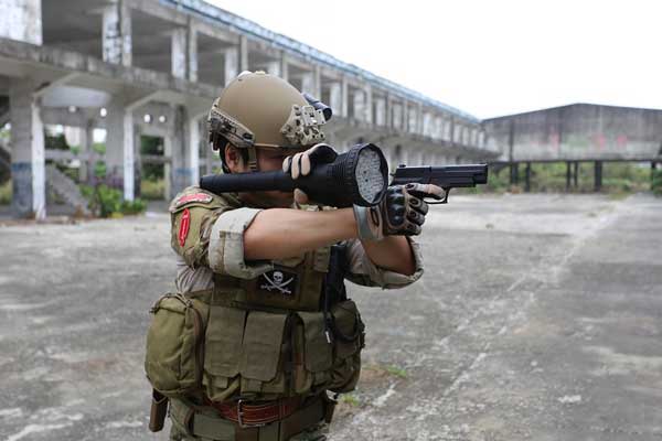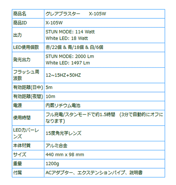 海外では既に警察や軍隊が導入するグレアブラスターの威力はアーマージャパン築地店にて体験が可能です。見た目と違って実際に体験すると、多くの方がこの商品の凄さに驚かれます。催涙スプレーも護身用品としての威力は絶大ですが、仮に室内や店舗にて噴射した場合、後の掃除が大変です。カーテンやソファ等の布地に付着した赤色は色素が強く容易に落とすことは出来ません。また白い壁に付いた場合も同様です。時には塗り替えが必要になる場合もあるかと思います。さらには催涙スプレーの場合は臭いも残ります。毎日営業されているコンビニ店など店内で噴射すると商品の廃棄にも繋がる場合があるかと思います。それに比べてグレアブラスターはライトを点灯した間だけ絶大な効果を発揮します。一般的な強力白色ライトは沢山販売されていますが、グレアブラスターの効果は全く異なります。赤青紫の点滅ライトを浴びると突進力が止み、簡単には向かって来ることができなくなります。そのため軍隊や警察は敵のアジトに突っ込む時などにも多く使用されます。相手の持つ銃の照準は取れなくなり、また刃物を持って向かって来る敵の突進も止められます。つまり突撃する際の味方の被害を軽減出来るからです。 参考までに動画もアップしていますが、モニターを通して見るグレアブラスターのライトに凄さを感じることは出来ないかと思われます。実際に店舗にて体験された方の購入率は高く、既にコンビニやホテルでは数多く導入されています。 105W出力のX-105Wは強力です。このライトを店頭で体験された方で直視可能な方は数少なく、軍用で使用される意味も十分に納得できます。写真の商品は付属のエクステンションバーを繋いだ状態です。通常はこの長さの状態に携帯用のストラップを取り付けて使用します。上記の写真でグリップが細くなっている部分はエクステンションパイプになります。 エクステンションパイプは21cmあるので、これを取り外すとグレアブラスターは28cmの 長さになりかなりコンパクトなライトになります。この状態でも携帯用のストラップは取り付け可能です。