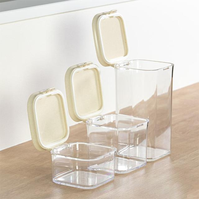 中身が見える透明な容器なので忙しい調理中に迷わず、選べて便利です。わざわざフタを開けて確認する手間も省けます。また、食品だけでなく「見せる収納」として小物類の収納箱としても便利です。