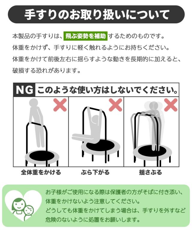 | 使用上のご注意 | ●トランポリン本体の組み立ては大人2名での実施をお願いいたします。 ●手すり取付け時、床に傷が付く場合がございます。床を保護するシートなどをご用意ください。 |