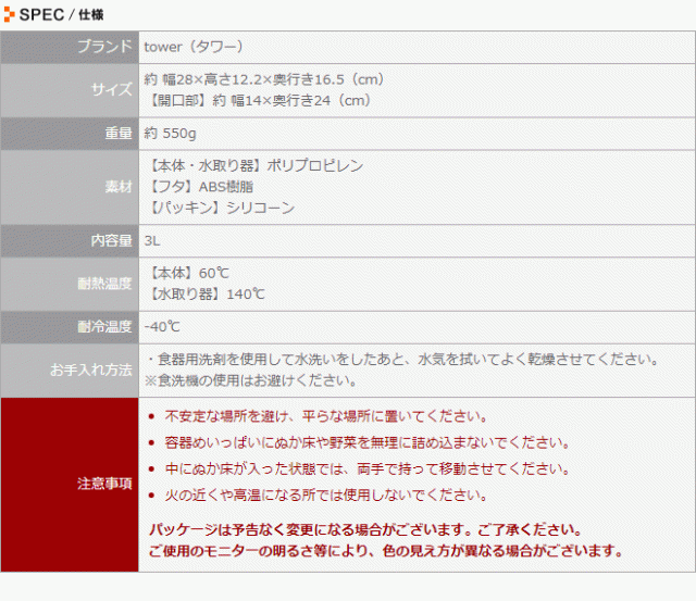 ぬか漬け容器 密閉ぬか漬けケース 水取り器付き 3L キッチン tower タワー おしゃれ