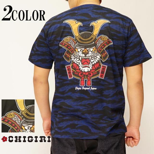 CHIGIRI[ちぎり] タイガーフェイス 兜 プリント チャーム付き 脇切替 和柄Tシャツ 半袖 メンズ CHS40-591