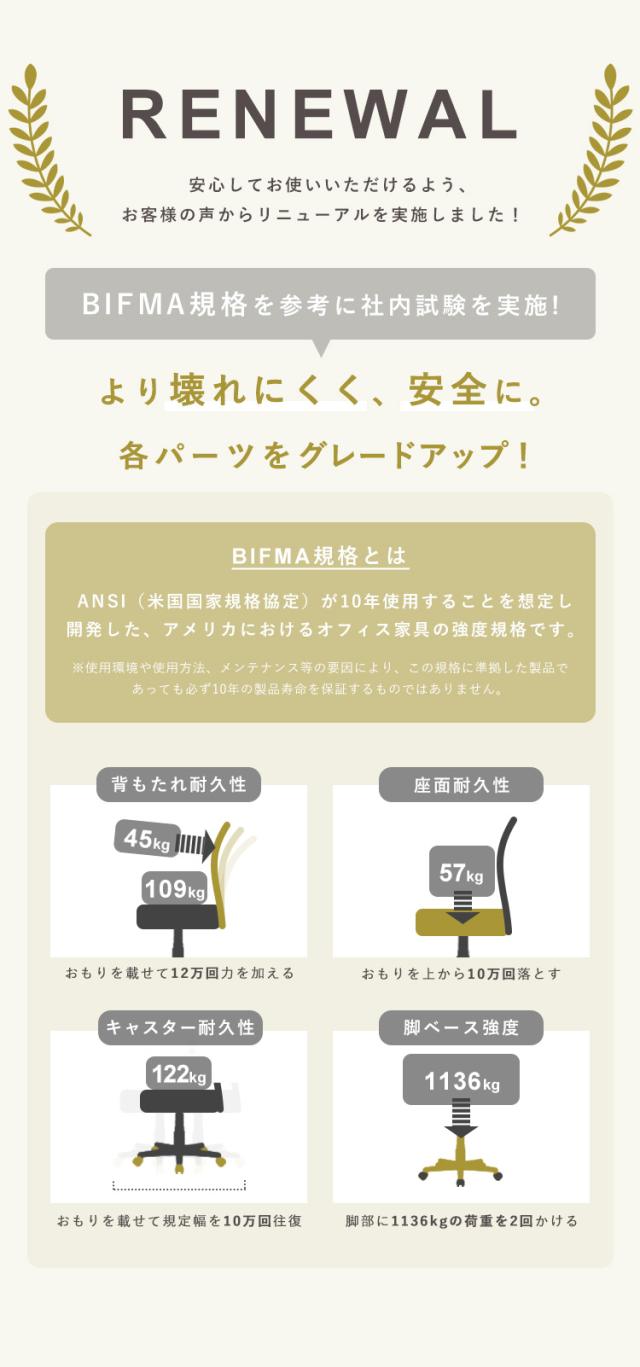 (BIFMA規格とは・・・ANSI(米国国家規格規定)が認定したアメリカにおけるオフィス家具の規格です。体格の良いアメリカ人に対応した基準のためより安全性が高いといわれています。)