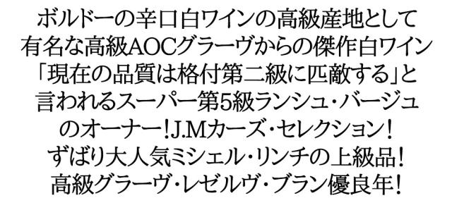 ボルドーの辛口白ワインの高級産地として 有名な高級AOCグラーヴからの傑作白ワイン 「現在の品質は格付第二級に匹敵する」と 言われるスーパー第5級ランシュ・バージュ のオーナー!J.Mカーズ・セレクション! ずばり大人気ミシェル・リンチの上級品! 高級グラーヴ・レゼルヴ・ブラン優良年!