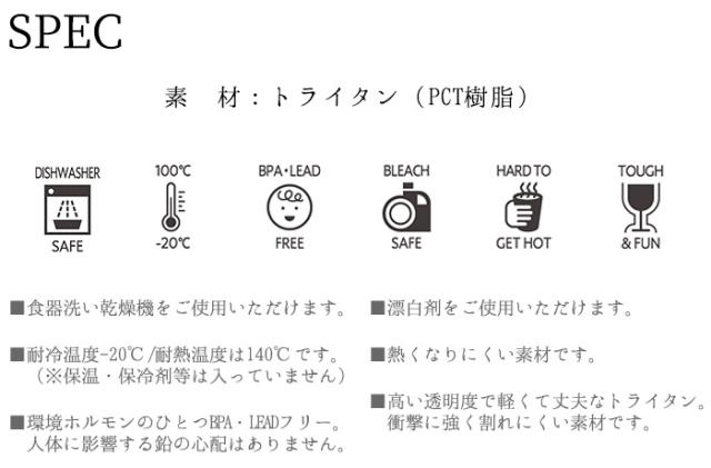 | 食器洗い乾燥機をご使用いただけます。 耐冷温度-20℃ / 耐熱温度140℃ (※保温・保冷剤等は入っていません。) 環境ホルモンのひとつBPA・LEADフリー。人体に影響する鉛の心配はありません。 漂白剤をご使用いただけます。 熱くなりにくい素材です。 高い透明度で軽くて丈夫なトライタン。衝撃に強く割れにくい素材です。 |