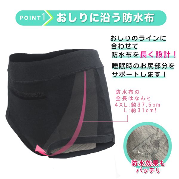 お尻に添う形の防水布が睡眠時の漏れを防止し、朝の気になるお尻周りを守ります。