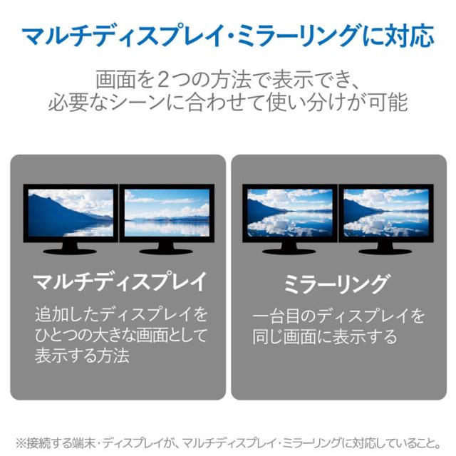 ●追加したディスプレイを一つの画面として表示するマルチディスプレイと、一台目のディスプレイと同じ画面を表示するミラーリングに対応しています。