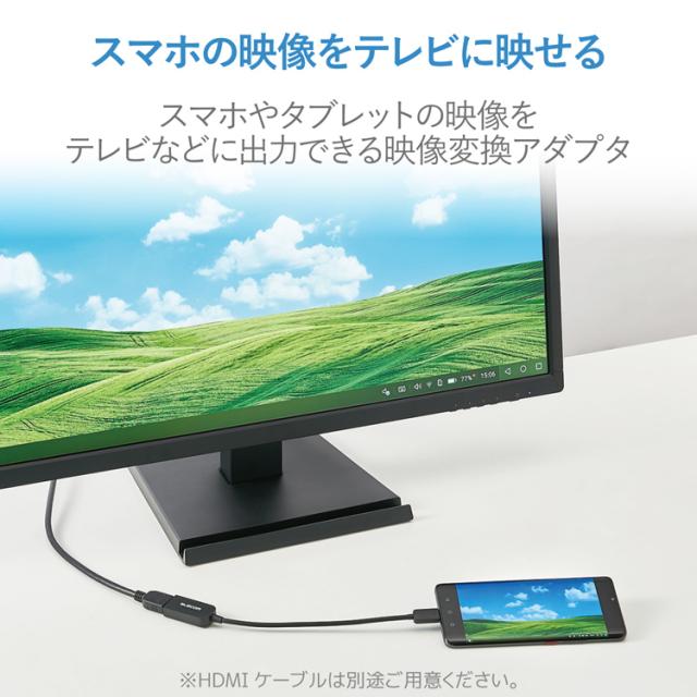 ●USB Type-C端子を搭載したスマートフォンやタブレットの映像信号を変換し、HDMI入力端子を搭載したテレビ・ディスプレイ・プロジェクターなどに出力できるUSB Type-C映像変換アダプタです。