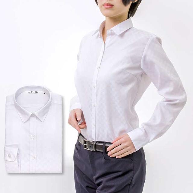 【Grace Field レディースシャツ】フレッシャーズからオフィスカジュアルまで着回しのしやすいシンプルな長袖 白ブラウスです。生地はチェックのドビー柄を採用。後ろ身頃にダーツをとり「くびれ」を強調、女性らしいシルエットを実現しています。汗を目立たせない様に汗ジミ加工を施した形態安定性のある生地を使用し、お洗濯後のお手入れも簡単なストレスフリーなブラウスです。サイズスペック表はシャツ本体の寸法となりますので購入時にご参考下さいます様お願いします。全体的にタイトめの仕上がりですので気になる方はひとつ大き目サイズをお勧め致します。試着程度でしたら、お客様に返送料をご負担いただきますがサイズ交換にご対応いたします。