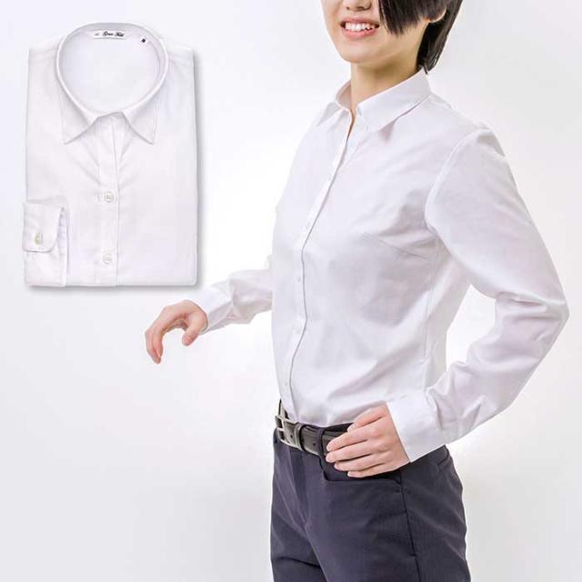 【Grace Field レディースシャツ】フレッシャーズからオフィスカジュアルまで着回しのしやすいシンプルな長袖 白ブラウスです。生地は柔らかな光沢感のある細かなストライプドビーを採用。後ろ身頃にダーツをとり「くびれ」を強調、女性らしいシルエットを実現しています。汗を目立たせない様に汗ジミ加工を施した形態安定性のある生地を使用し、お洗濯後のお手入れも簡単なストレスフリーなブラウスです。サイズスペック表はシャツ本体の寸法となりますので購入時にご参考下さいます様お願いします。全体的にタイトめの仕上がりですので気になる方はひとつ大き目サイズをお勧め致します。試着程度でしたら、お客様に返送料をご負担いただきますがサイズ交換にご対応いたします。