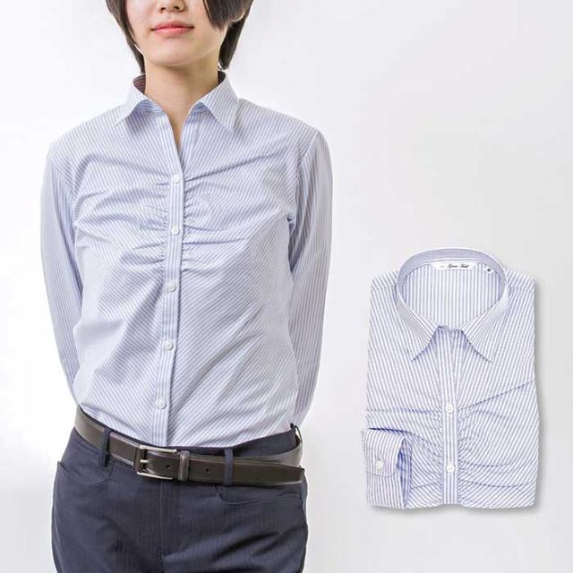 【Grace Field レディースシャツ】フレッシャーズからオフィスカジュアルまで着回しのしやすいシンプルな長袖 ストライプブラウスです。後ろ身頃にダーツをとり「くびれ」を強調、女性らしいシルエットを実現。胸ギャザーの程良い立体感でエレガンスな印象を与えてくれます。汗を目立たせない様に汗ジミ加工を施した形態安定性のある生地を使用し、お洗濯後のお手入れも簡単なストレスフリーなブラウスです。サイズスペック表はシャツ本体の寸法となりますので購入時にご参考下さいます様お願いします。全体的にタイトめの仕上がりですので気になる方はひとつ大き目サイズをお勧め致します。試着程度でしたら、お客様に返送料をご負担いただきますがサイズ交換にご対応いたします。