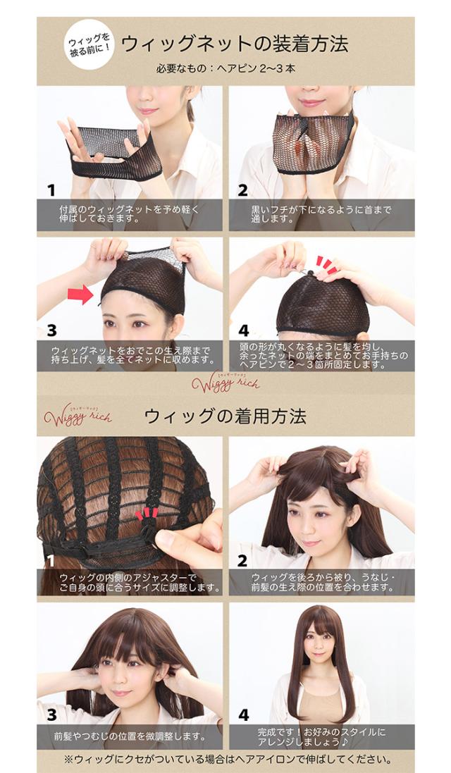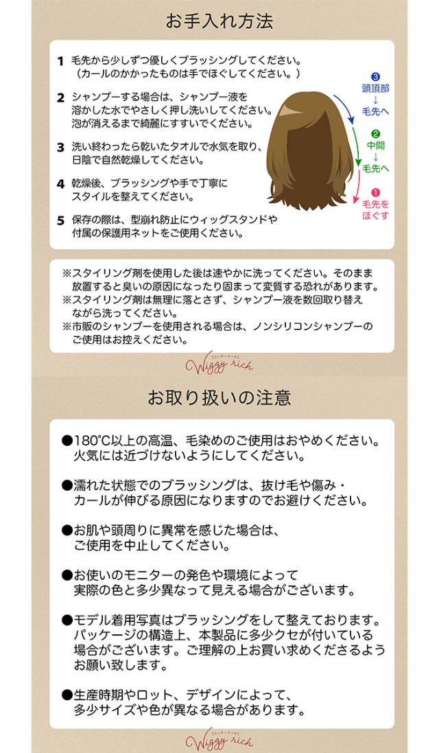 ■商品について注意事項:取り扱い注意・180℃以上の高温、毛染めのご使用はおやめください。・火気には近づけないようにしてください。・濡れた状態でのブラッシングは、抜け毛や傷み・カールが伸びる原因になりますのでお避けください。・お肌や頭周りに異常を感じた場合はご使用を中止してください。※実際の色とパッケージ画像の色が多少異なって見える場合がございます。また、パッケージの構造上、本製品に多少クセが付いている場合がございます。ご理解の上お買い求めくださるようお願いします。※生産時期やロット、デザインによって、多少サイズや色が異なる場合があります。ウィッグのお手入れ方法毛先から少しずつ優しくブラッシングしてください。(カールのかかったものは手でほぐしてください。)シャンプーする場合は、シャンプー液を溶かした水でやさしく押し洗いしてください。泡が消えるまで綺麗にすすいでください。洗い終わったら乾いたタオルで水気を取り、日陰で自然乾燥してください。乾燥後、ブラッシングや手で丁寧にスタイルを整えてください。保存の際は、型崩れ防止に付属の保護用ネットやウィッグスタンドをご使用ください。※スタイリング剤を使用した後は速やかに洗ってください。そのまま放置すると臭いの原因になったり固まって変質する恐れがあります。※スタイリング剤は無理に落とさず、シャンプー液を数回取り替えながら洗ってください。※市販のシャンプーを使用される場合は、ノンシリコンシャンプーはお控えください。商品画像は可能な限り実物の色に近づくよう調整しておりますが、お使いのモニター設定、お部屋の照明等により実際の商品と色味が異なって見える場合がございます。又、同じ商品の画像でも、撮影環境によって画像の色に差異が生じる場合がございます。