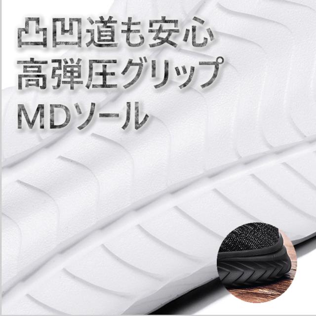 【滑り止め】底面には滑り止め効果のあるソールを採用して、濡れた地面等での歩行をサポートします、変形しにくて、軽くて爽やかな履き心地。