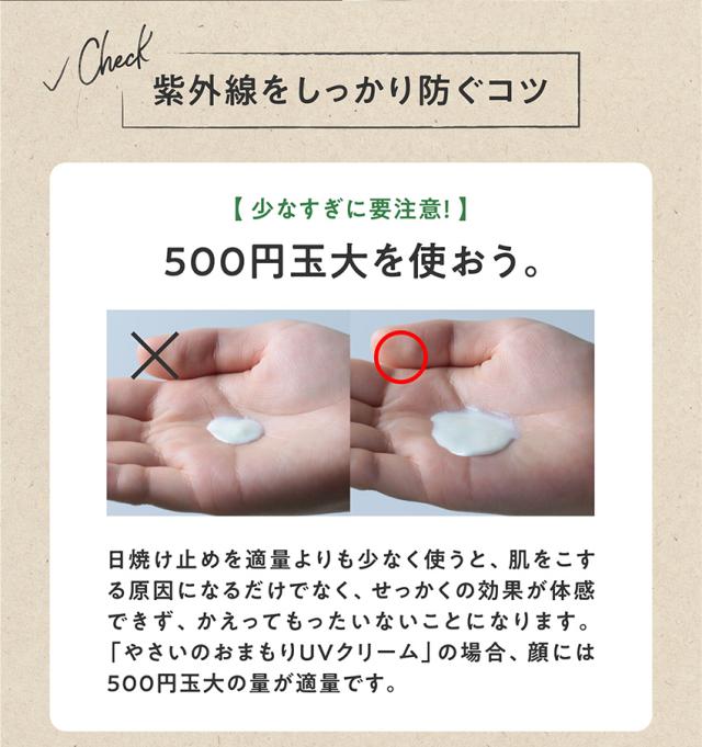 [使用方法] 適量(500円玉大程度)を手に取り、顔、からだにムラなくのばしてください。日焼けしやすいTゾーンや頬の部分、その他黒ずみが気になる箇所にもう一度重ね塗りをすると効果的です。量が少ないと、十分な日焼け止め効果が得られません。効果的に製品をご使用いただくためには、汗をかいた後やハンカチで拭いた後などにも、こまめに塗り直してください。