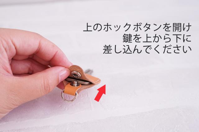 | 機能 | スナップボタンを開けて、上から鍵を入れる |