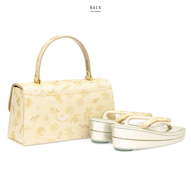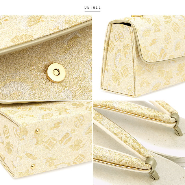 バッグと草履の鼻緒には、吉祥柄である宝尽くしが、上品に描かれています。