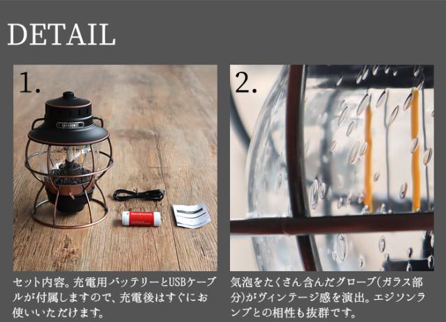 大人気の「BAREBONES(ベアボーンズ)」のランタンシリーズに、レトロかつモダンなデザインが登場です。戦前の北米鉄道会社で使われてきたレイルロードランタンを模したこちらのランプ。ハイセンスな佇まいに、気泡の入ったシードグラスグローブ(ガラス部分)がエジソン球タイプのLEDとマッチし、胸がときめくようなやさしい雰囲気を醸し出します。ハイモードで3.5時間、ローモードで100時間点灯が可能。便利な充電式で、とってもエコ!使う場所も選びません。