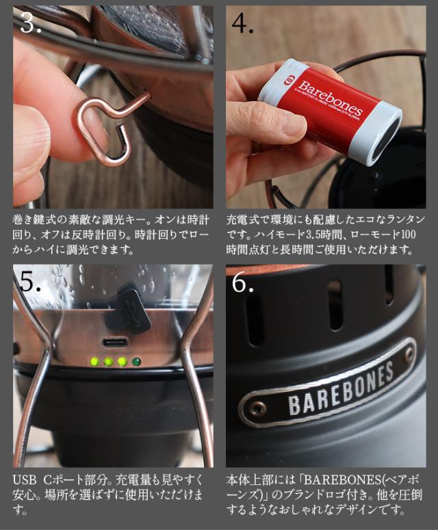 自立式なので、何かと不便の多いアウトドアでも置き場所に困らないがgood!にぎりやすいグリップ付きのハンドルもあり、そのまま持って歩いてもよし、ランタンスタンドに掛けても◎。キャンプサイトがいっそう華やぎます!どんなインテリアとも相性がいいので、ガレージやリビング、寝室でのご使用もおすすめです。LEDランタンのメリットはなんと言っても電源ONするだけで即時点灯!一般的なガソリンランタンやガスランタンと違い熱くなりにくいので、お子さまやペットと一緒のキャンプも安心♪ファミリーキャンプや、夜キャンプの心強いギアになってくれます。BAREBONESならではの洗練された美しいデザインで、差がつくキャンプライフを実現できそうです!