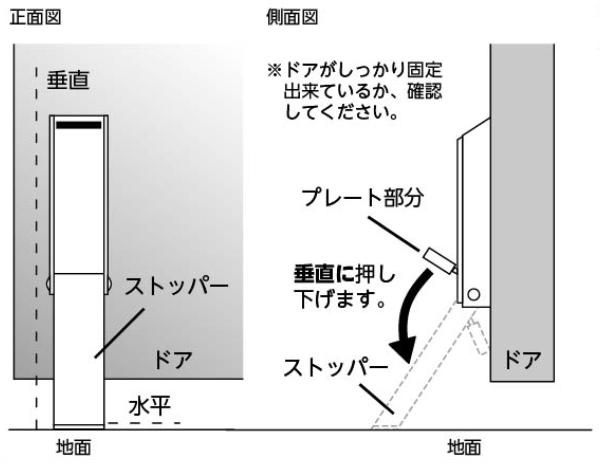 ドアを固定する場合は、ドアを固定したい位置に手で押さえながら、ストッパーのプレート部分を足で垂直に押し下げます。