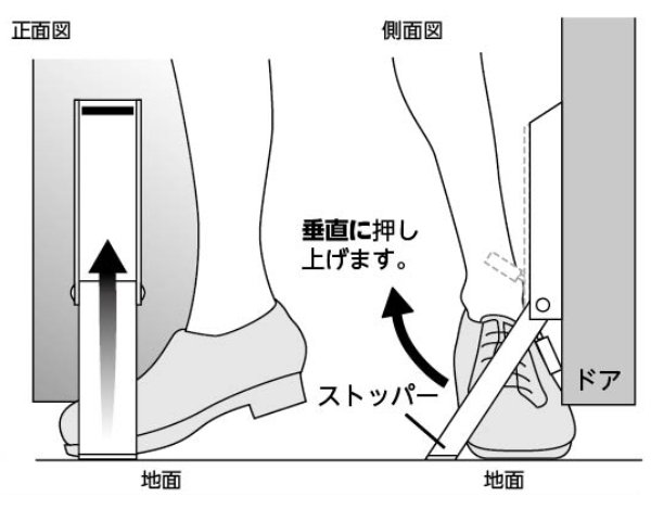収納時はドアを手でゆっくり押し戻しながら、ストッパーとドアのすき間に足のつま先を入れて、ストッパーを垂直に押し上げます。