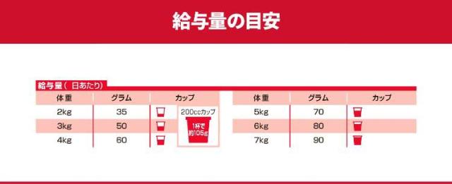 2kg:35g、3kg:50g、4kg:60g、5kg:70g、6kg:80g、7kg:90g(200ccカップ1杯で約105g)