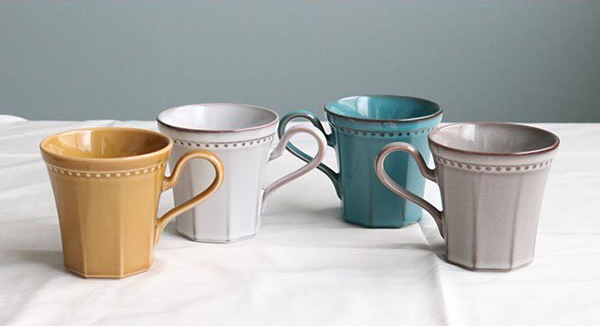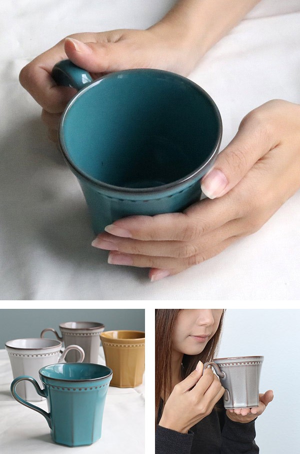 どのカラーも、毎日のティータイムをもっと素敵にしてくれます。アンティークのような擦れたデザインに見えますが、全体に釉薬が塗られつるりとした質感です。
