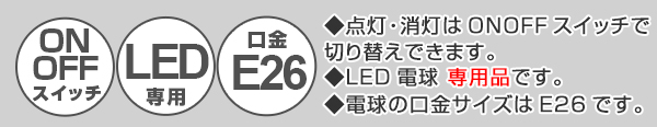 | 備考 | 電球:AC100V 9W E26 スイッチ:タッチセンサー ワイヤレス、USB充電機能付き |