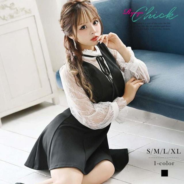 一部予約販売 ミニドレス RyuyuChick ネックリボン フレア 袖付き ミニ フリル袖 キャバ ドレス キャバドレス ミ