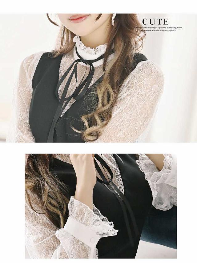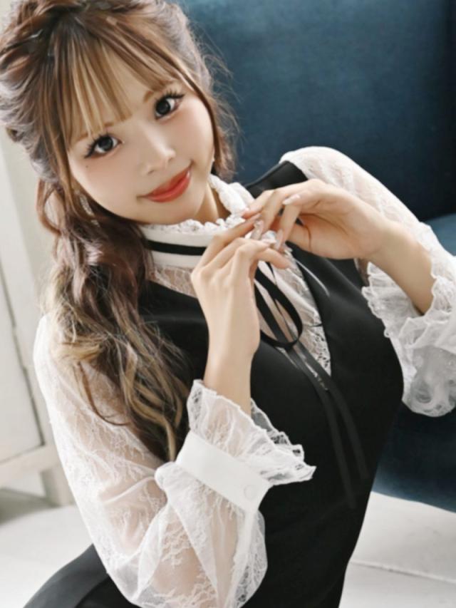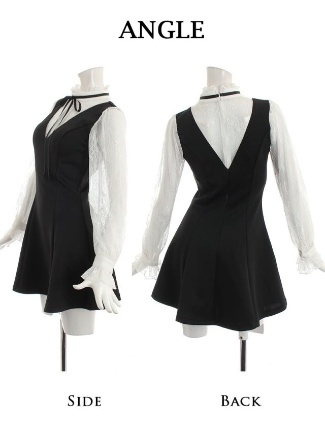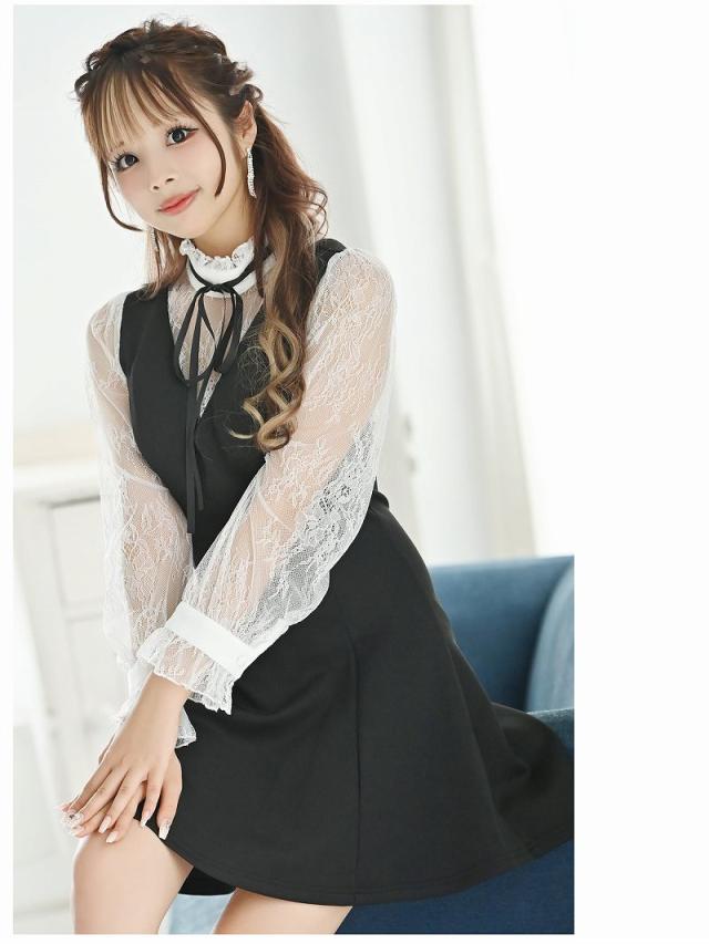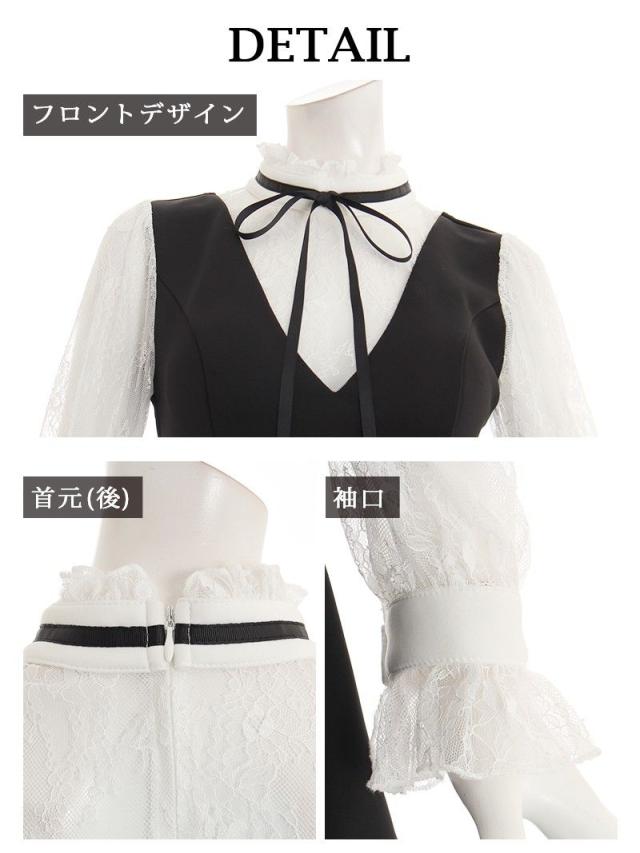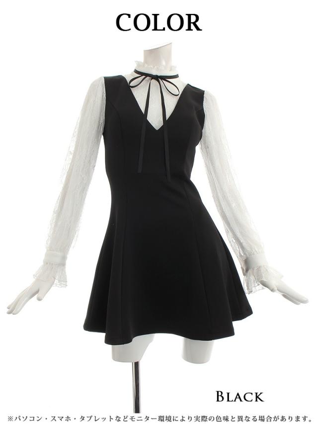 ☆ネックリボンでお嬢様スタイルが叶うフレアミニドレスはモノトーンカラーなので大人可愛く魅せられるレースキャバドレス♪