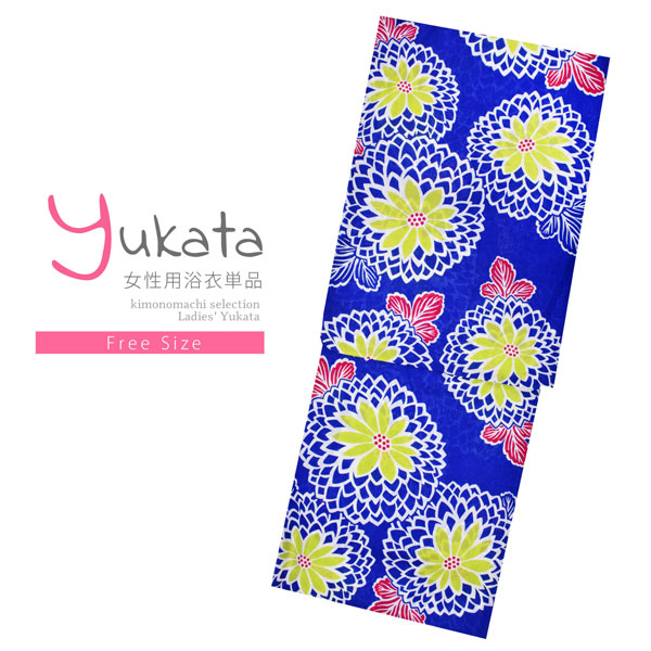 浴衣 レディース 単品「青地 八重菊、黄緑」フリーサイズ レトロ モダン 大人柄 女性浴衣単品 女浴衣 ゆかた yukata 【メール便不可】