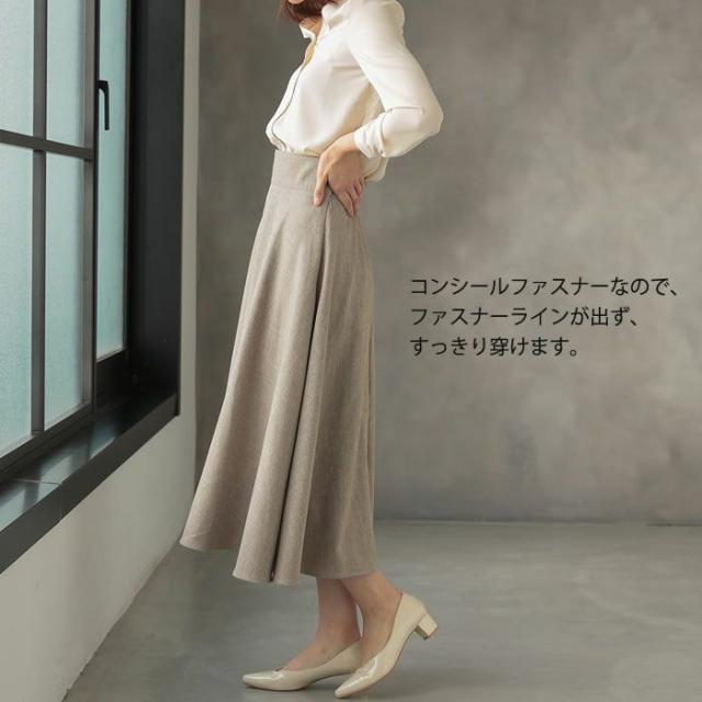 膝下までの長さと落ち着いた素材感で上品に着こなせます。