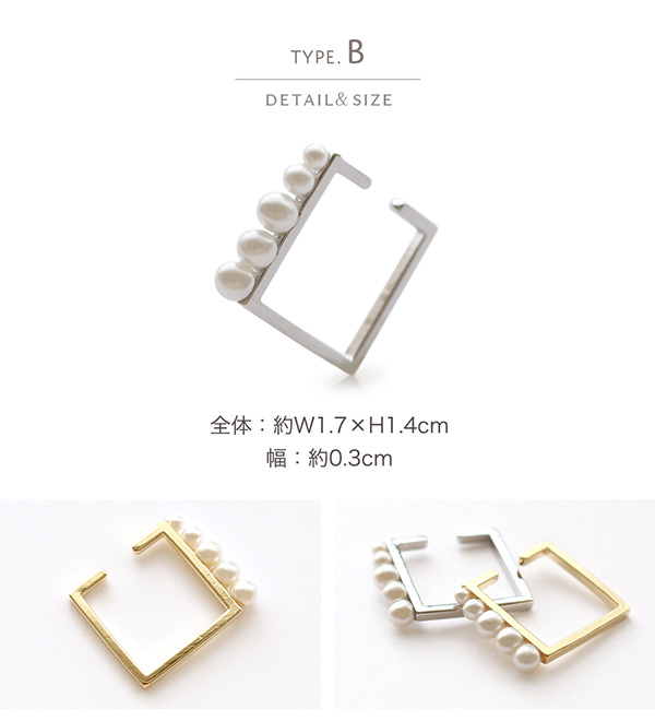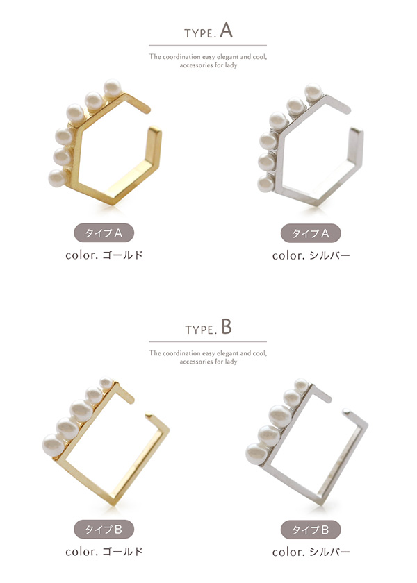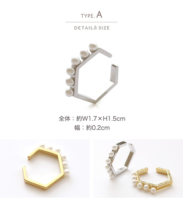 | 耳の軟骨部分に引っ掛けるだけの簡単でストレスフリーなウェアリング(イヤーカフ)です。 六角形タイプとスクエアタイプの各ゴールド・シルバーの4種類。 イヤリングのように痛くなりにくく、ノンホールの方でも気軽にオシャレが楽しめます! | |