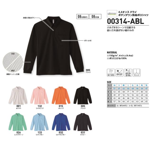 ポロシャツ メンズ 無地 glimmer グリマー 4.4オンス ドライ ボタンダウン 長袖 スポーツ ゴルフ ビズポロ ユニフォーム 00314 【00314-ABL】 送料無料 通販M3