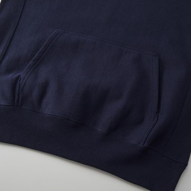 ざら感のあるざっくりした風合い、乾いた硬い肌ざわりの厚手生地が特徴のプルオーバーパーカ。