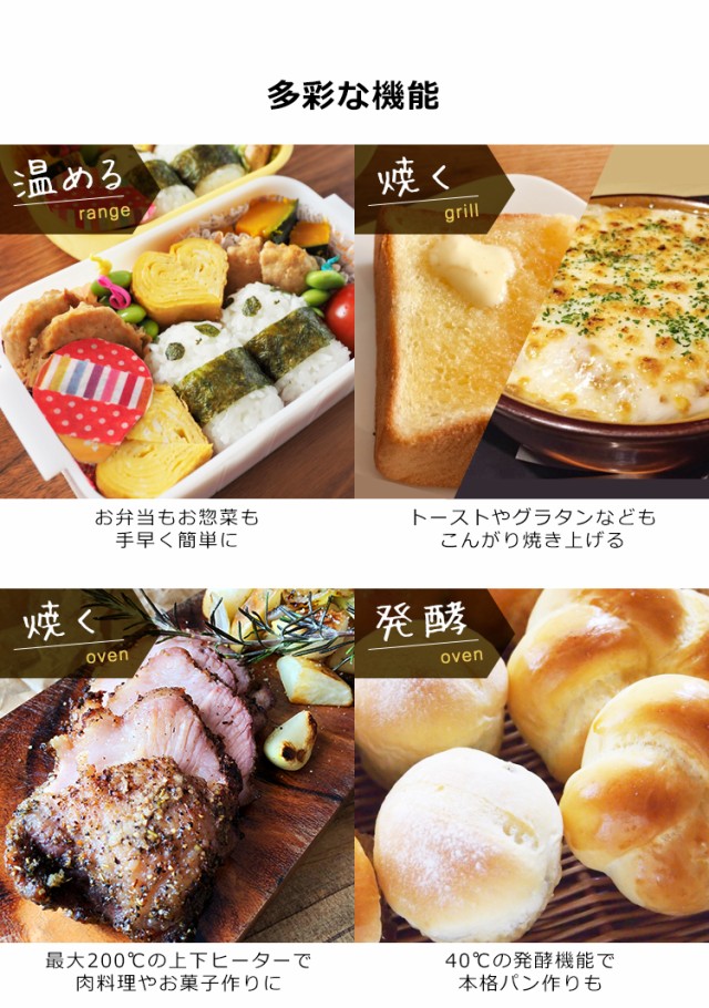 あたため(レンジ)、トースト(焼く)、温める(フライ)、発酵機能(オーブン)など多彩な機能。