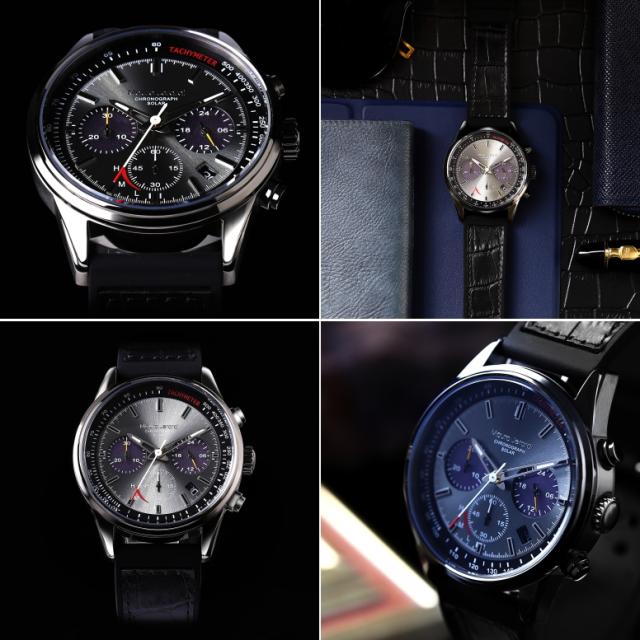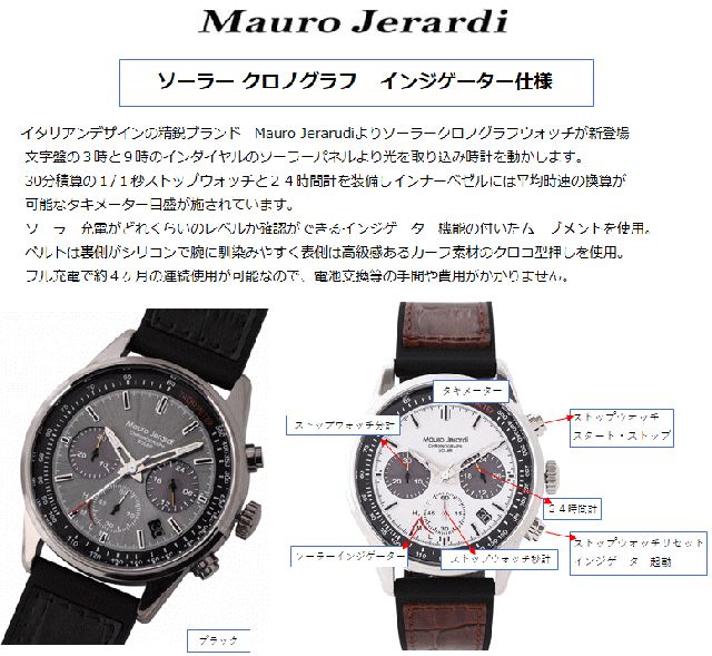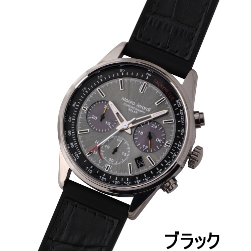 イタリアンデザインの精鋭ブランド Mauro Jerarudiよりソーラークロノグラフウォッチが新登場!文字盤の3時と9時のインダイヤルのソーラーパネルより光を取り込み時計を動かします。30分積算の1/1秒ストップウォッチと24時間計を装備しインナーベゼルには平均時速の換算が可能なタキメーター目盛が施されています。ソーラー充電がどれくらいのレベルか確認ができるインジゲーター機能の付いたムーブメントを使用。ベルトは裏側がシリコンで腕に馴染みやすく表側は高級感あるカーフ素材のクロコ型押しを使用。フル充電で約4ヶ月の連続使用が可能なので、電池交換等の手間や費用がかかりません。