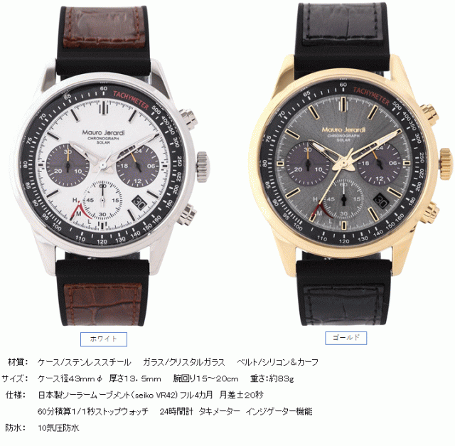 ■カラー:ブラック、ホワイト、ゴールド■サイズ(約):ケース径43mmφ、厚さ13.5mm、腕回り15〜20cm■重さ(約):83g■材質:ケース/ステンレススチール、ガラス/クリスタルガラス、ベルト/シリコン&カーフ■仕様:日本製ソーラームーブメント(seiko VR42) フル4カ月 月差±20秒 60分積算1/1秒ストップウォッチ 24時間計 タキメーター インジゲーター機能■防水:10気圧防水