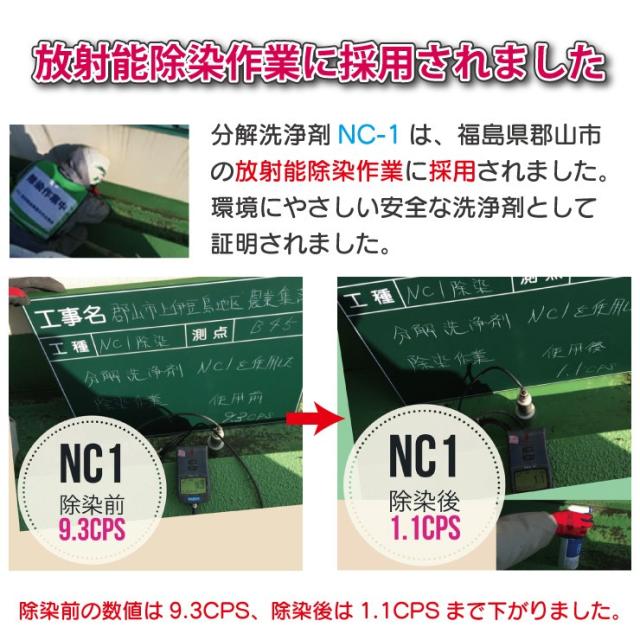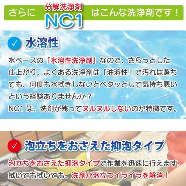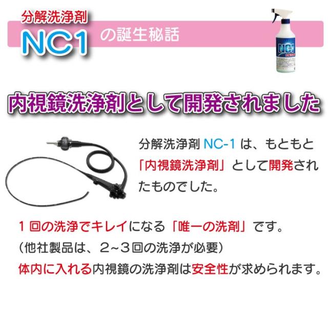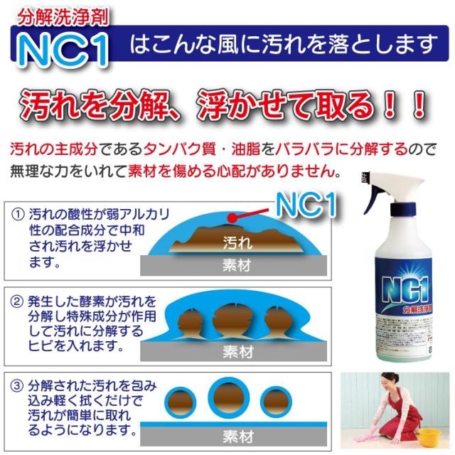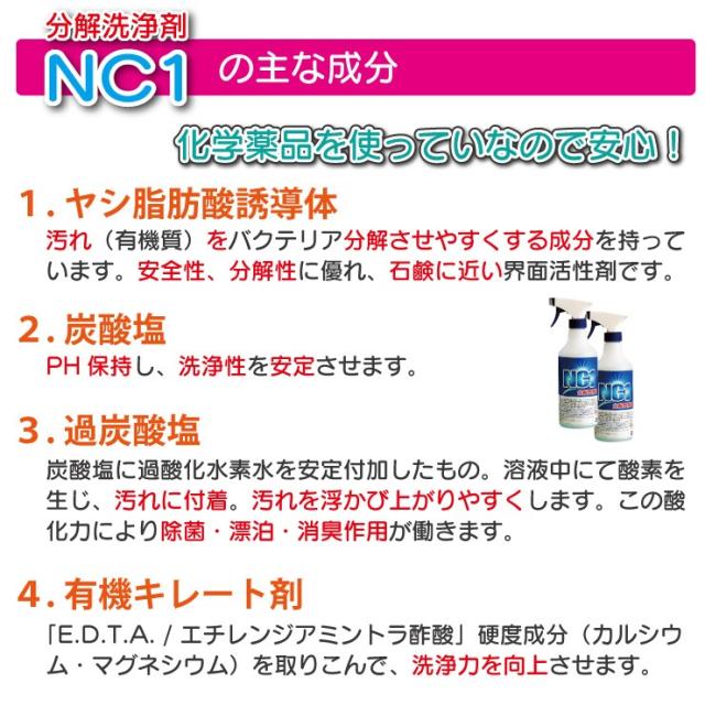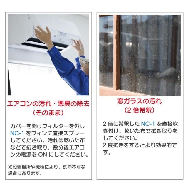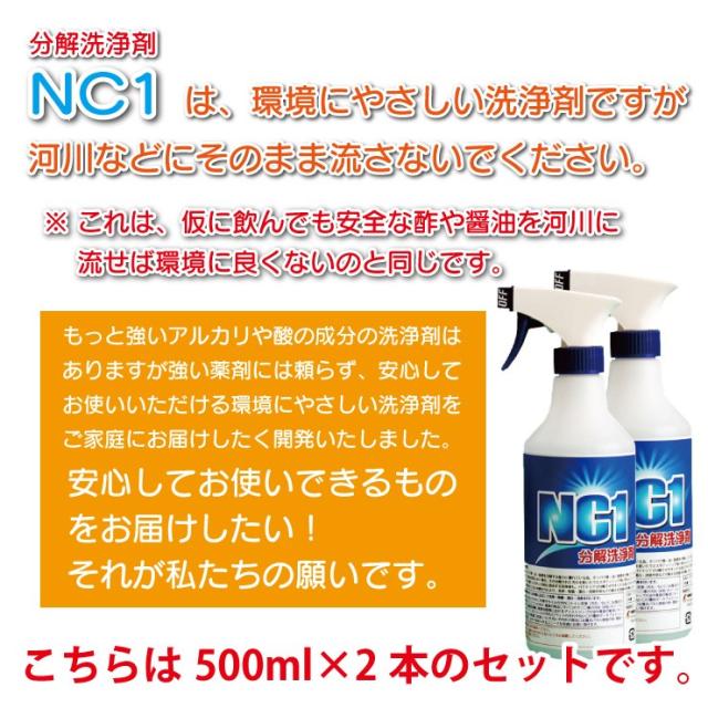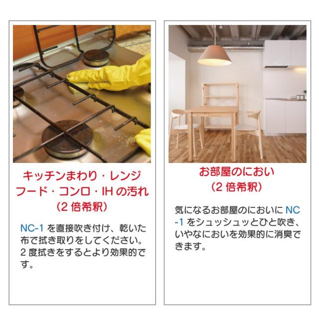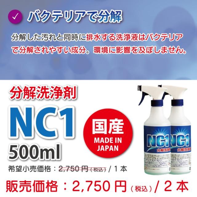 【NC1の一般的な使用用途】分解洗浄剤NC1は有機に反応し洗浄・除菌・漂白・消臭を行います。◯タバコのヤニ◯ペットの汚れや臭い◯エアコンの汚れや除菌・消臭◯キッチンまわり(レンジフード・ガスコンロの汚れ)◯窓ガラスの汚れ◯車内の除菌・消臭・汚れの除去◯カーペット・絨毯・床などの汚れ◯業務用厨房におけるグリストラップの油や悪臭の解消○お部屋の除菌・消臭商品名:分解洗浄剤 NC1(2本セット)品番:NC1-500主成分:ポリオキシアルキレンアルキルエーテル内容量:500ml×2生産国:日本製