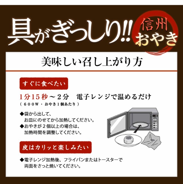 内容量 ・おやき 1コ約100g(野沢菜・切干大根・きのこ・あんこ・なす・野菜・ポテト・にら・かぼちゃ 各1コ)
