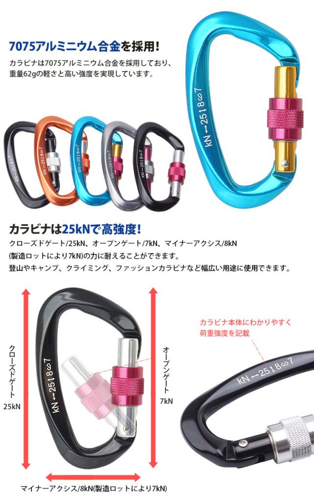 カラビナは7075アルミニウム合金を採用しており、重量62gの軽さと高い強度を実現しています。