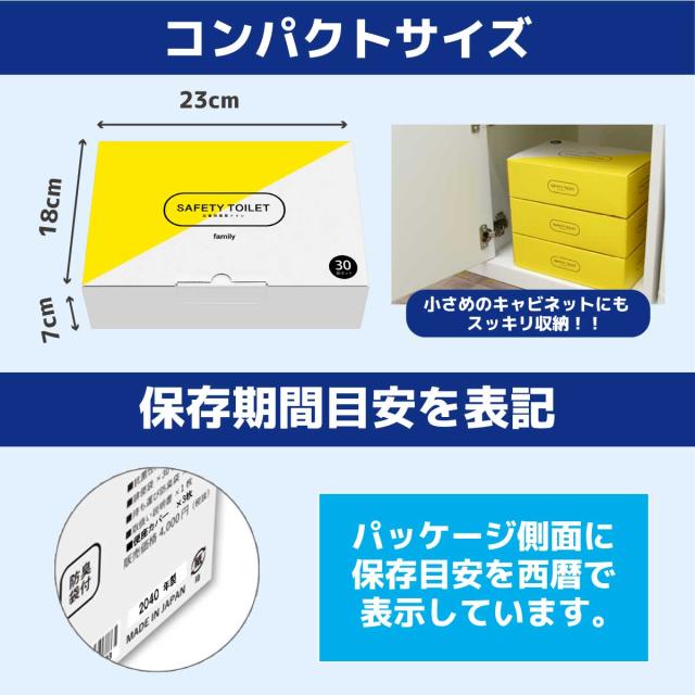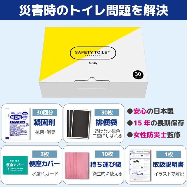 簡易トイレ 30回 携帯トイレ 防災 トイレ 凝固剤 災害用トイレ 非常用トイレ 車 アウトドア 登山 手袋付き 抗菌グレード 大型防臭袋付 SAFETY TOILET family