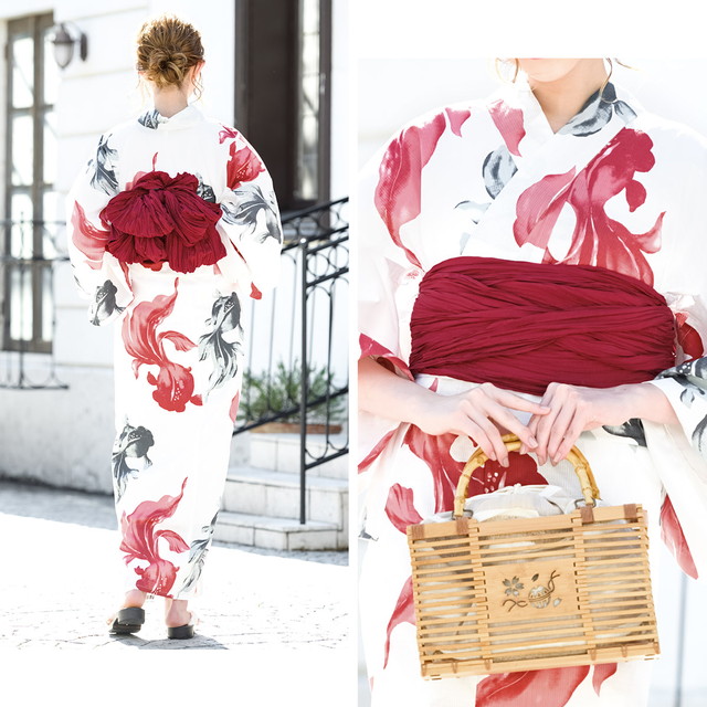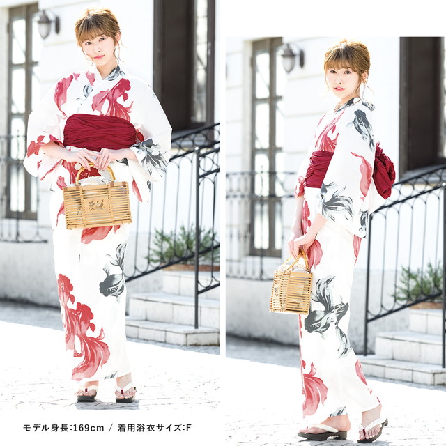 浴衣セット レディース レトロ 浴衣セット 大人 3点セット ホワイト 白 レッド 赤 グレー 灰色 金魚 キンギョ モダン 吸水速乾 CoolPass 変わり織り 夏祭り 花火大会 女性用 S・フリー