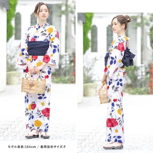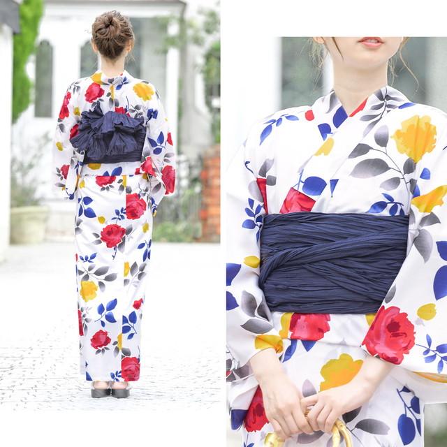 浴衣セット レディース レトロ 浴衣セット 大人 3点セット ホワイト 白 カラフル 薔薇 バラ 花 フラワー モダン 変わり織り 夏祭り 花火大会 女性用 S・フリー