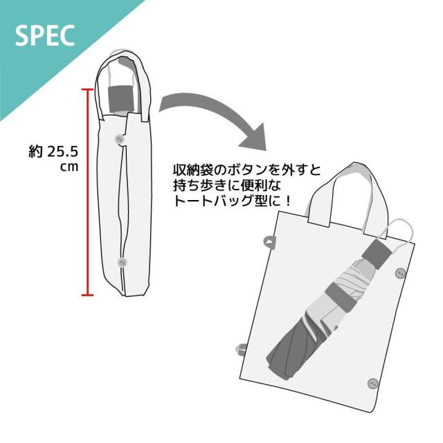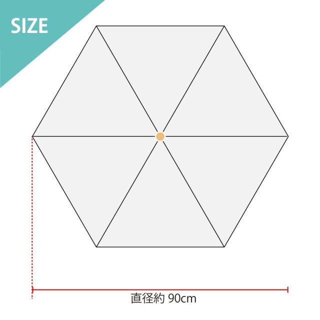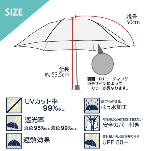 【サイズ】[親骨の長さ]:50cm、[全体の長さ]:53.5cm、[直径]:88cm、[持ち手の長さ]:約3.5cm、[持ち手の太さ]:約3cm、[収納時の長さ]:約25.5cm、[共袋のサイズ]:約9cm×24cm(広げたときのサイズ:19×24cm)※サイズは当店平置き実寸サイズです。【重さ】約180g(本体のみ)【仕様】晴雨兼用折りたたみ日傘、[開閉]:手動式【素材】ポリエステル100%、内側ポリウレタンコーティング