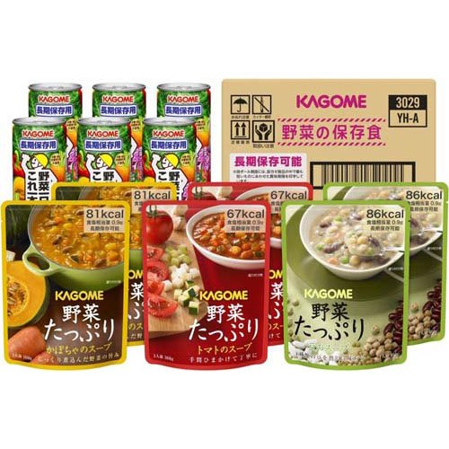 | トマトのスープ160g*2袋、豆のスープ160g*2袋、かぼちゃのスープ160g*2袋、野菜一日これ一本長期保存用190g*6本 |