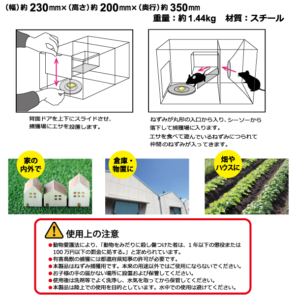 | 使用上のご注意 | ●動物愛護法により、「動物をみだりに殺し傷つけた者は、1年以下の懲役または100万以下の罰金に処する。」と定められています。 ●有害鳥獣の捕獲には都道府県知事の許可が必要です。 ●本製品はねずみ捕獲用です。本来の用途以外ではご使用にならないでください。 ●お子様の手の届かない場所に設置および保管してください。 ●使用後は洗剤等でよく洗浄し、水気を取ってから保管してください。 ●本製品は陸上での使用を目的としています。水中での使用は避けてください。 ●捕獲後の処理に関しましてはお住まいの各地方自治体にご相談ください。 |
