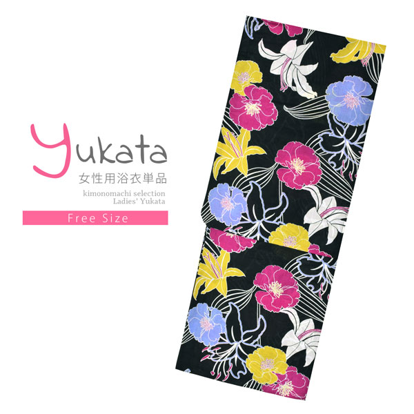 浴衣 レディース 単品「黒地 マツバボタン、ブルー、赤紫」フリーサイズ レトロ モダン 大人柄 女性浴衣単品 女浴衣 ゆかた yukata 【メール便不可】