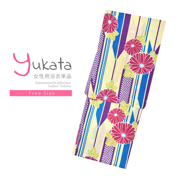 浴衣 レディース 単品「クリーム色地 矢羽根、紫 菊、赤紫」フリーサイズ レトロ モダン 大人柄 女性浴衣単品 女浴衣 ゆかた yukata 【メール便不可】